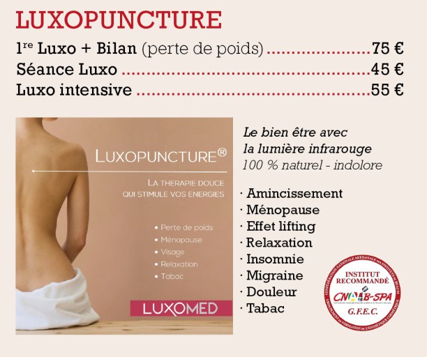 La luxopuncture, aussi appelée luxothérapie, est une technique reflexe, qui stimule vos énergies, par un rayonnement infrarouge, sur certains points d'acupuncture. (perte de poids-menopause-arret du tabac-relaxation-sommeil-ronflement-douleurs-.......)